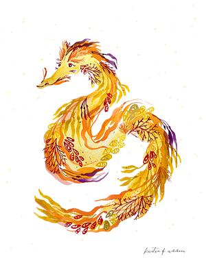 The Golden Kelpie. This beautiful creature is a mythical shape-shifting spirit inhabiting lochs in Irish and Scottish folklore. The print is crafted from an original watercolor featuring highly saturated stone ground watercolors. Always a fan favorite, the Dragon Kelpie Collection is home to our most beloved and shared artworks.